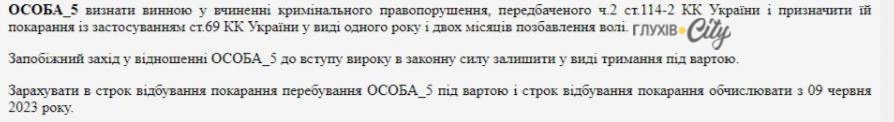 Жительці Глухова присудили один рік та два місяці позбавлення волі. Строк відбування покарання обчислюється з 9 червня 2023 року.