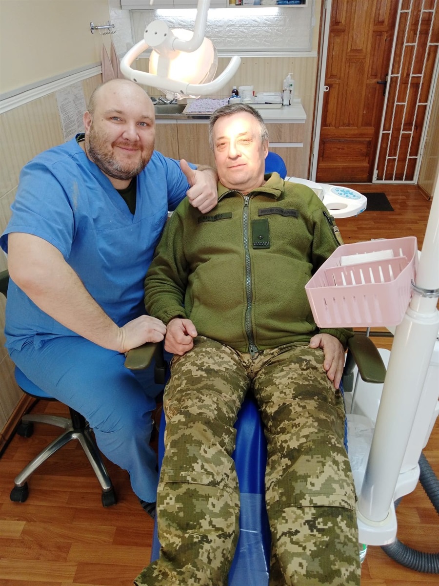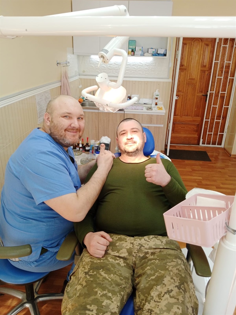 “Лікую всіх військовослужбовців: і ЗСУ, і нацгвардійців, і СБУ, поліцейських, прикордонників. Усіх людей, які беруть участь у захисті Батьківщини. І цивільних Допомога безкоштовна. Ми забезпечені всім, включно зі стоматологією. У нас є і рентген, і ендомотор, і скейлери, і матеріали хороші”, – пояснює лікар.