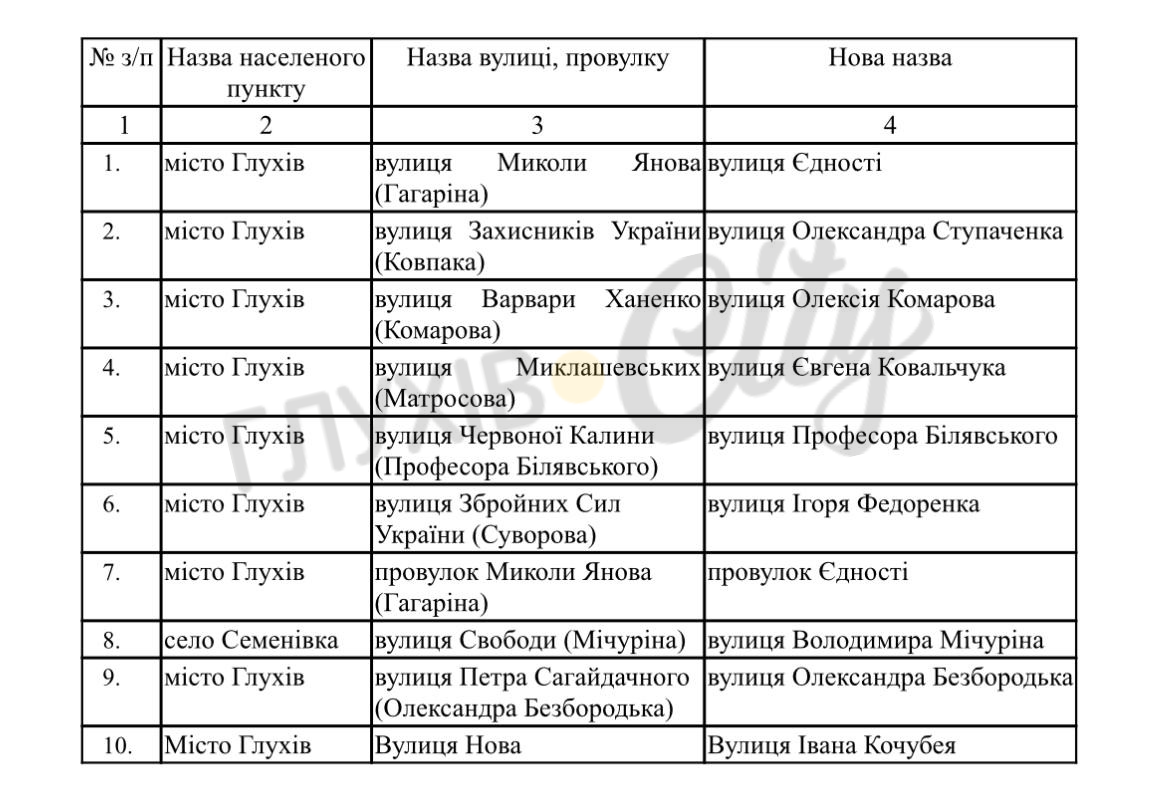 Виконавчий комітет Глухівської міської ради ухвалив рішення про перейменування восьми вулиць на території громади. Це рішення було прийнято з метою декомунізації та дерусифікації міського простору, а також ушанування пам’яті загиблих Героїв.