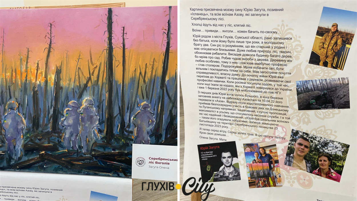 На презентації в ліцеї №45 мати глухівчанина Юрія Загути Олена поділилася історією сина, який загинув 23 листопада 2023 року на Луганщині. Також показала написану нею картину «Серебрянський ліс Янголів». На ній зображені силуети воїнів на фоні випаленого пейзажу.