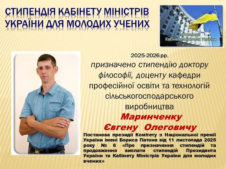 Стипендію Кабінету Міністрів України для молодих вчених отримав Євген Маринченко. Він — доктор філософії, доцент кафедри професійної освіти та технологій сільськогосподарського виробництва Глухівського НПУ імені Олександра Довженка.