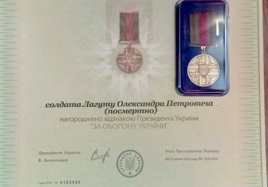 Медаллю «За оборону України» відзначили захисника з Глухова Олександра Лагуту. Як розповіли журналістам Глухів.City рідні воїна, нагороду передали його дружині Наталії.