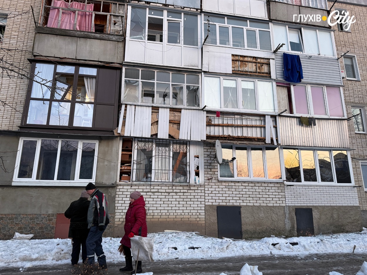 Чергова атака російських безпілотників на Глухів призвела до значних руйнувань у житловому районі міста. Потужний вибух, що пролунав пообіді, пошкодив шість багатоповерхівок, залишивши десятки квартир без вікон та опалення у розпал морозів.