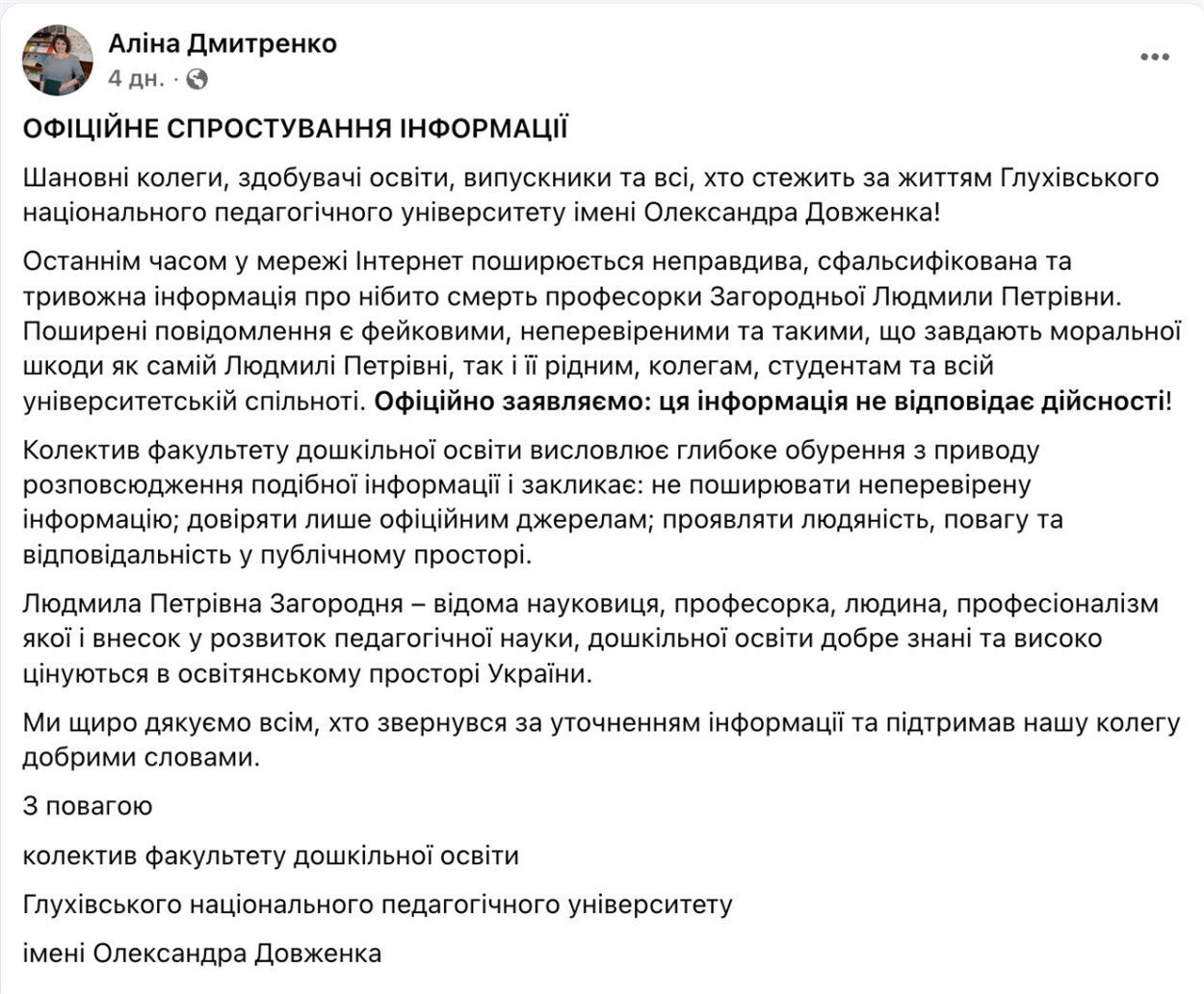Урешті Глухівський педагогічний університет, де працює пані Людмила, був змушений офіційно спростовувати цю інформацію.