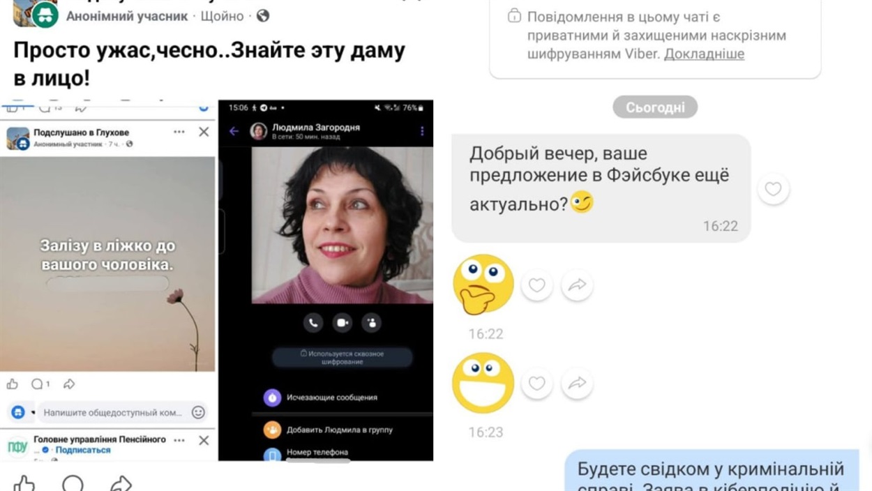 «Мені надіслали новий “буклет” з іншої місцевої групи. Там було написано: “Залізу в ліжко до вашого чоловіка”, і знову — мій номер телефону», — каже пані Людмила.