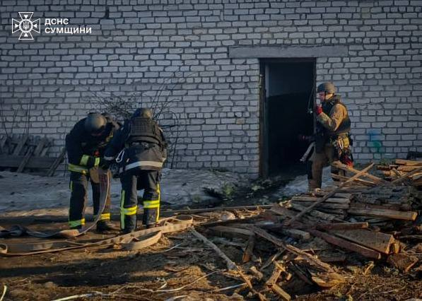 На фото, які показали рятувальники ДСНС, видно наслідки авіаудару по Глухову. На місці виникла пожежа, яку загасили. Через загрозу повторних атак рятувальники були змушені тимчасово призупиняти роботи та переміщатися у безпечні місця.