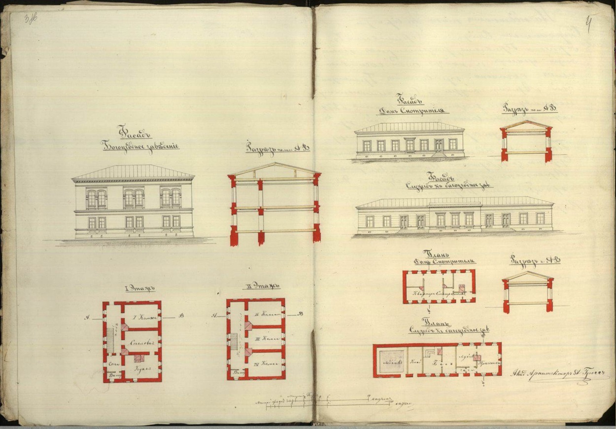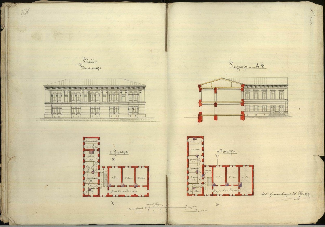 Архітектором Олександром Гроссом були складені плани та креслення для будівлі богадільні, лікарні (Г-подібний корпус) та приміщення для наглядача цього закладу, які мали бути побудовані на садибі, придбаної1871 року в Ніколи Терещенка.
