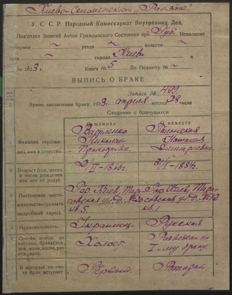 У травні 1923 року він одружився з Наталією Дмитрівною Полонською (1884-1973), яка була колись його ученицею в гімназії, теж істориком, приват-доцентом університета св. Володимира. У цей час вона працювала в Київському археологічному інституті. А з 1924 до 1941 року (з перервою в 1934-1938рр, коли була звільнена з роботи з політичних мотивів.) – у Всеукраїнській академії наук. Паралельно, у 1927-1932 рр, працювала професором Київського художнього інституту.