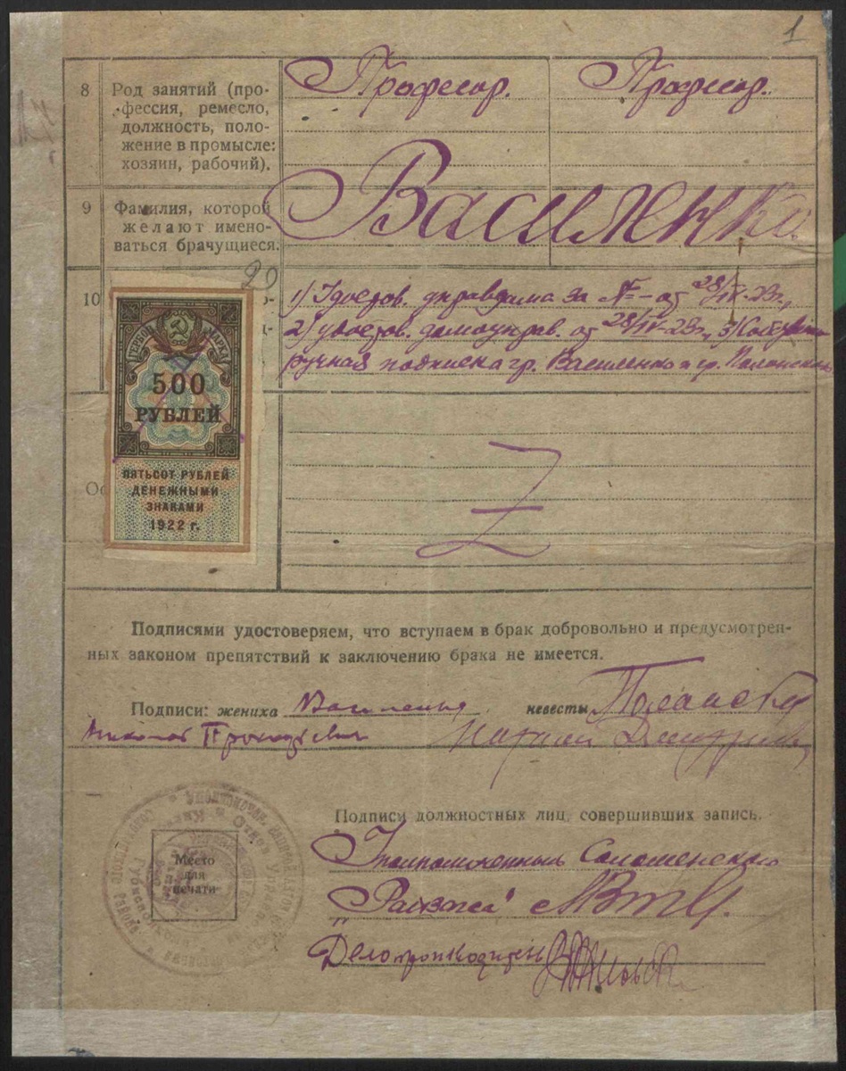 Згодом Микола Василенко перейшов на історичний факультет, - розповідає його дружина, - він почав працювати у проф. О.Г. Брікнера, який читав російську історію. Мик. Прок. став його кращим учнем, його «nachschlagebuch». Під його керівництвом написав він першу велику роботу присвячену земським соборам, яка була призначена до друку, але не надрукована у зв’язку з виїздом професора Брікнера за кордон… Не обмежуючись самою наукою, Мик. Прок. цікавився політичними питаннями. На той час Дорпатський університет жив ліберальнішим життям, ніж російські університети. В його бібліотеці виписували й видавали студентам літературу, яка була заборонена у Росії (Маркс, Енгельс, Ласаль, Драгоманов, тощо були цілком приступні студентам)…