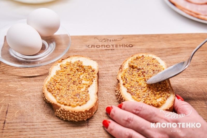 Змастіть дві скибочки хліба 1 столовою ложкою гірчиці в зернах.