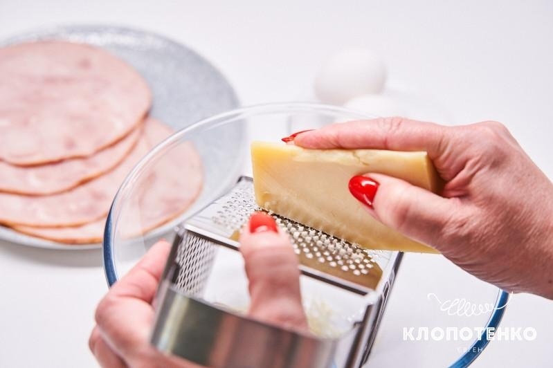 Змішайте 2 столові ложки тертого пармезану зі 100 г тертого на дрібній тертці сиру Грюйєр. Поки відкладіть.