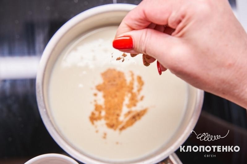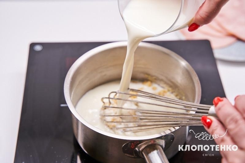 Потім вливайте тонкою цівкою 200 мілілітрів молока 2,5 %, продовжуючи безперервно помішувати віничком. Соус варіть до густоти.