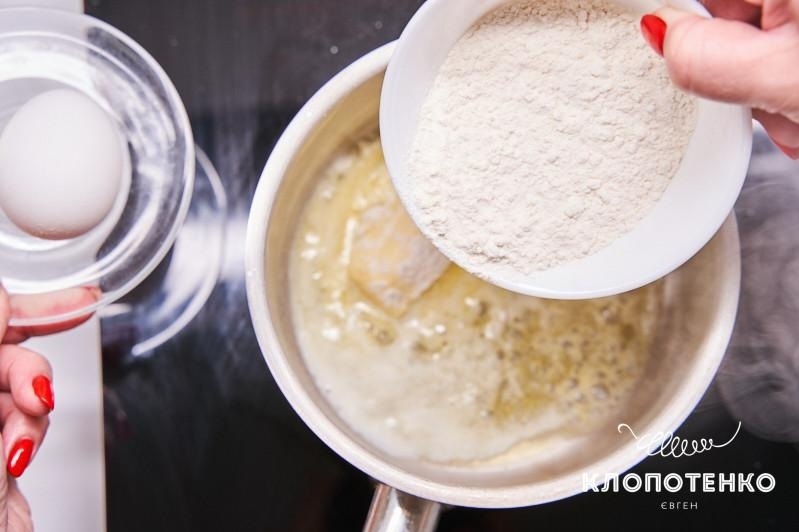 Зробіть соус бешамель. У невеличкій каструлі або сотейнику розтопіть 25 грамів вершкового масла 82,5 % та додайте 25 грамів борошна. Підсмажте до легкого коричневого відтінку, постійно помішуючи віничком.
